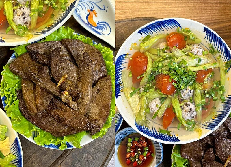 Điểm mấu chốt của mâm cơm này chính là sự đối lập hài hòa: có cái đậm đà, thơm bùi của gan chiên, cái thanh mát, chua dịu của canh mọc và chút nhẫn nhẹ đặc trưng của mướp đắng. Đây là sự kết hợp hoàn hảo để kích thích vị giác mà không gây cảm giác ngấy.