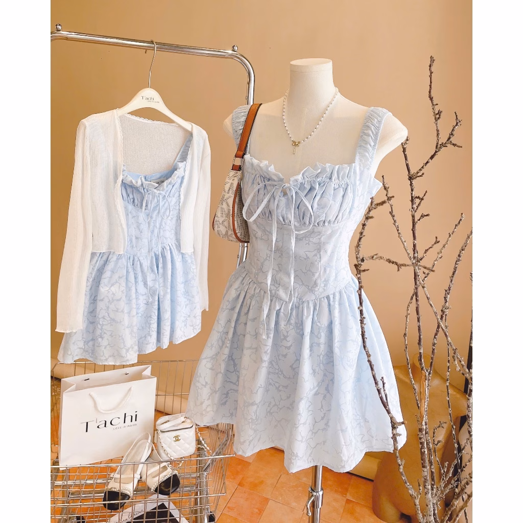 🔥 |Khositl| set đầm xanh 2 dây bèo xếp ly thắt nơ + áo khoác crop trắng tay dài đang giảm giá!