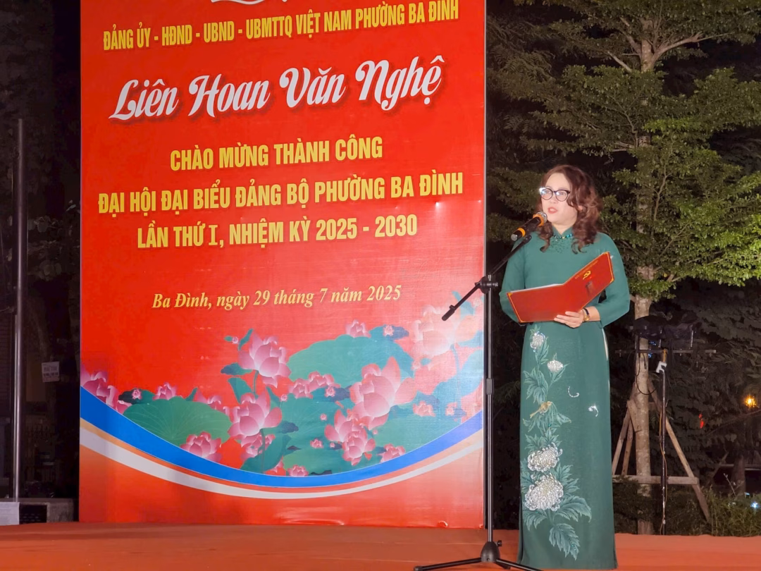 Tối ngày 29 tháng 7, tại phường Ba Đình, một buổi liên hoan văn nghệ đặc biệt đã được tổ chức để chào mừng thành công của Đại hội đại biểu lần thứ I Đảng bộ phường Ba Đình, nhiệm kỳ 2025-2030. Sự kiện này thể hiện niềm vui và tự hào của Đảng bộ, chính quyền và nhân dân phường Ba Đình sau một Đại hội thành công.