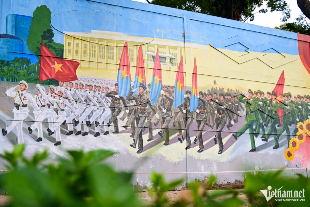 Những bức tranh này tái hiện một cách sinh động hình ảnh các phương tiện quân sự, chiến sĩ, máy bay, pháo binh… trên mảng tường bê tông. Dự án ‘Việt Nam tươi đẹp’ được thực hiện bởi nhóm họa sĩ do anh Lê Tuấn Minh Viên dẫn đầu từ giữa tháng 6. Với tổng diện tích lên đến gần 2.000 m², công trình không chỉ phủ kín đoạn tường trên vỉa hè rộng mà còn tạo ra một không gian lý tưởng cho việc thi công và thưởng lãm.